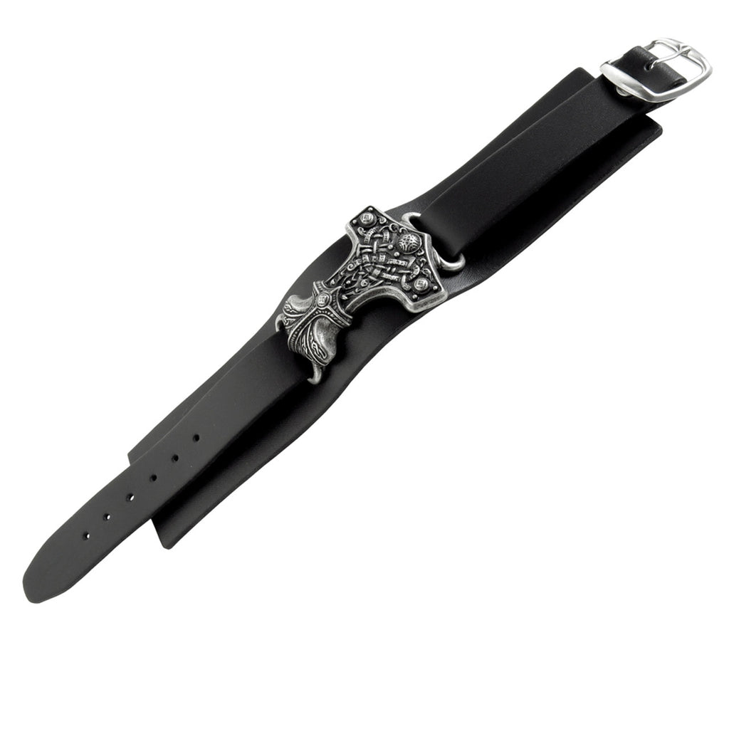 Wide black leather wrist strap bearing large pewter Hammer of Thor, adjustable length, fastened with a buckle.